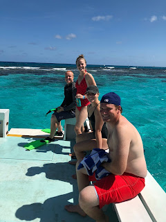 After a breakfast in the room we knew our first full day was going to be a laid back one. The kids had told us that they just wanted to hang out at the beach so that's what we did:) We found a nice little spot just outside our room and planted ourself for most of the day. Right off this beach is a plethora of animal life in the water. Beautiful coral and an abundance of beautiful fish! We all (well most of us) enjoyed taking time to get some reading in! Rick was in the water most of the time and Brach was in his room finishing up some homework assignments. After a while he joined the other boys in the water snorkeling.